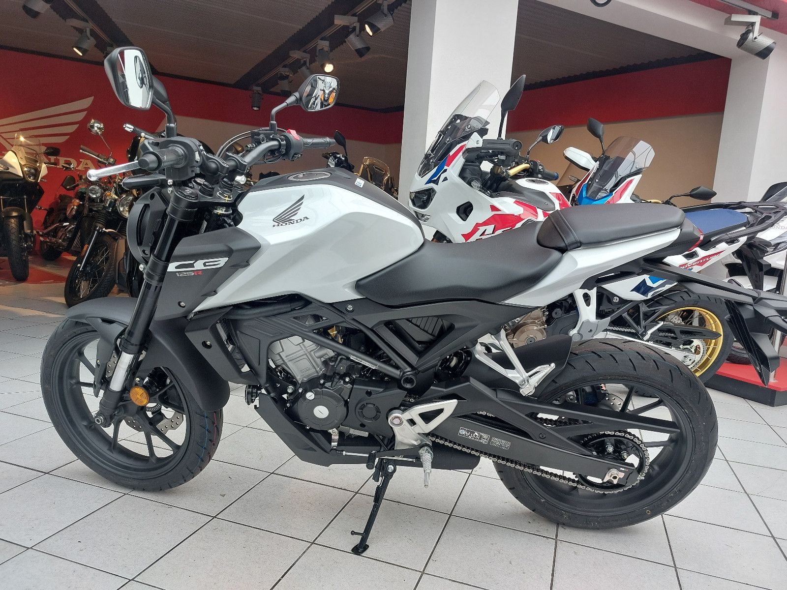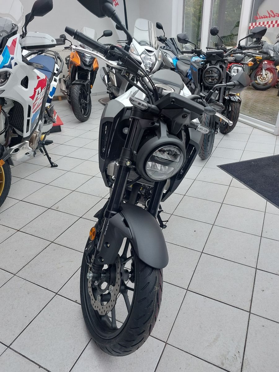 Honda CB125R, Neufahrzeug mit Tageszulassung, Modell 2025, der DOHC-Einzylindermotor mit 4 Ventilen liefert volle 11KW (15PS), das Neo Sports Café Design begeistert Jung und Alt, Das markante Design mit dem Stahlrohrrahmen ist ein echtes Statement. Ein hochmodernes 5 Zoll TFT-Farb Display und LED-Komplettbeleuchtung sind Premium-Merkmale. Die präzise Abstimmung der neuen Showa SFF-Big Piston Upside Down-Gabel begeistert. Die CB125R setzt voll auf Minimalismus und bringt von Fahrt zu Fahrt mehr Fahrspaß. Dank der kompakten Größe ist das Bike leicht zu handhaben und die von den größeren Modellen übernommenen Merkmale sorgen für einen perfekten Einstieg in die Welt richtiger Motorräder. Gewicht vollgetankt 130 kg, 150/60R17 Hinterreifen, 6-Gang Getribe, Tankinhalt 10,1 Liter, CO2 g/km kombiniert (g/km) 50 g/km Benzinverbrauch (Liter pro 100 km (Honda Messwerte gem. WMTC)) 2,2 l/100km, Abgasnorm Euro 5+, Kfz-Steuer frei.