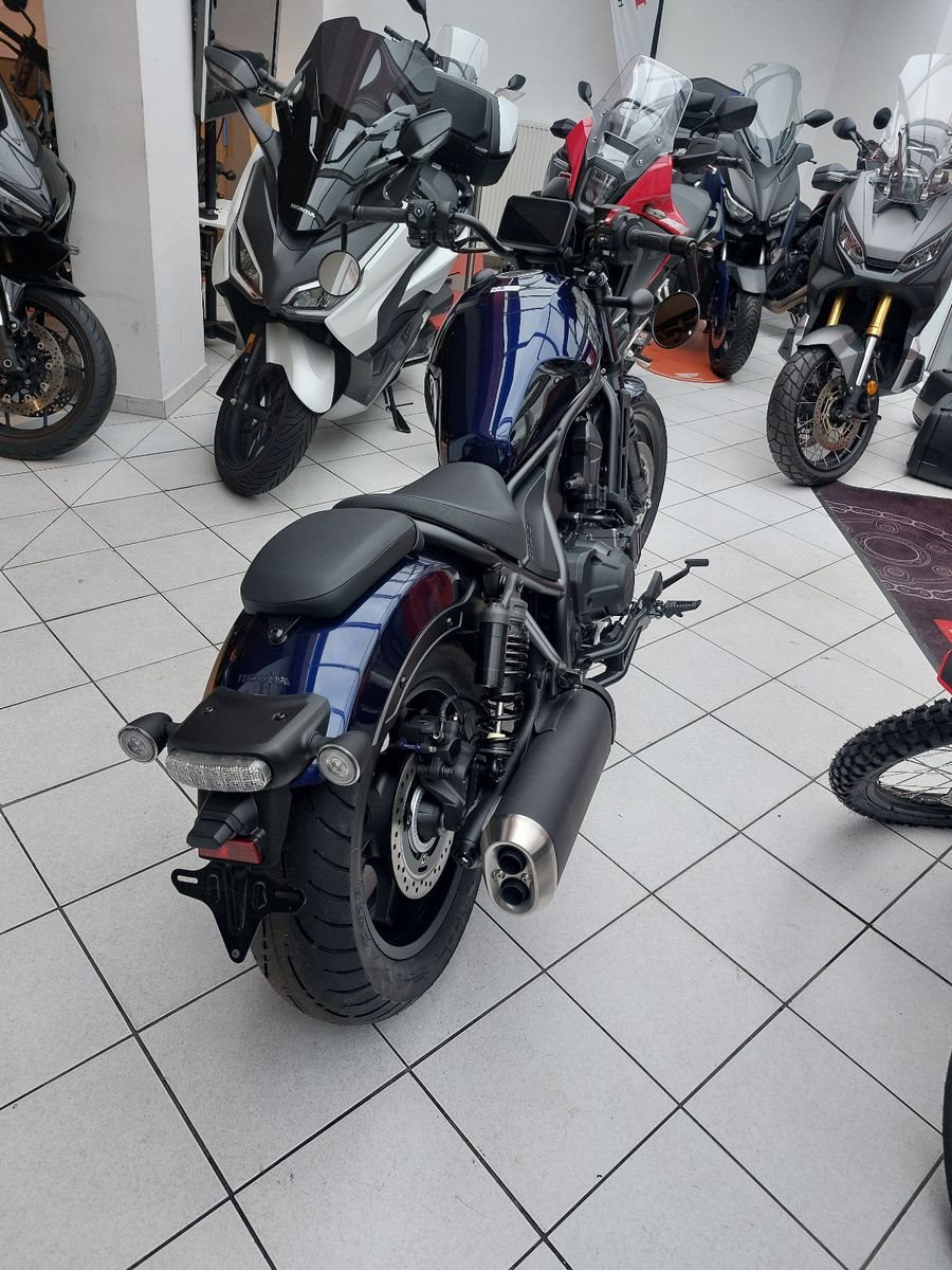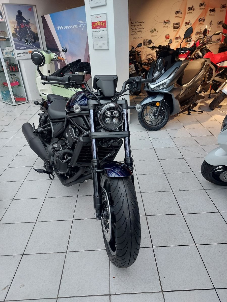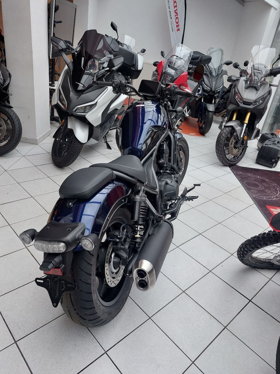 Honda CMX1100 Rebel, Neufahrzeug, Modell 2025, Blau, DCT-Getriebe, Euro 5+, Verbrauch Honda Messwerte gem. WMTC 5,3 l/100km, CO2 Ausstoss 123 g/km, Lenkerendspiegel Honda Orginalzubehör.