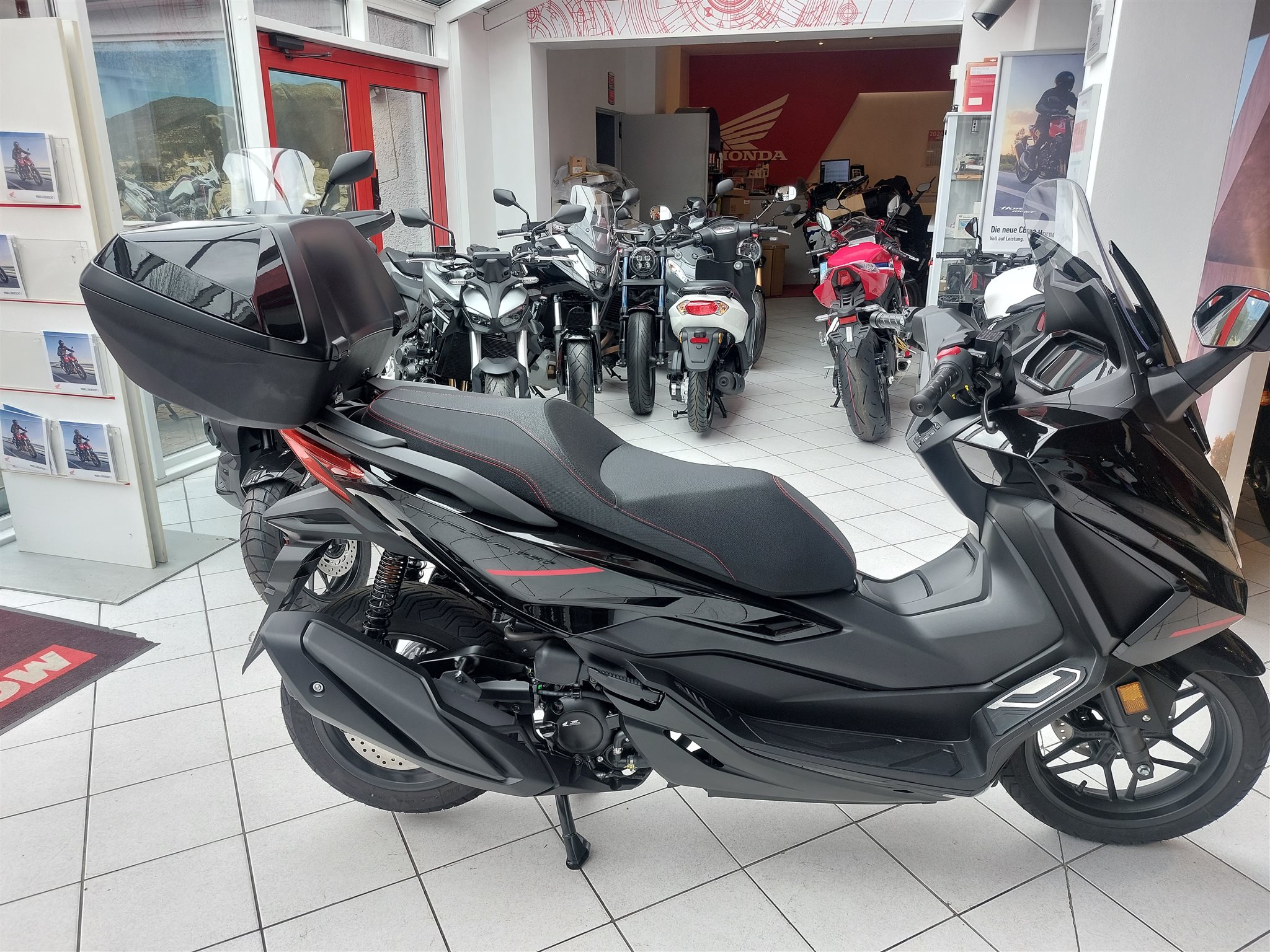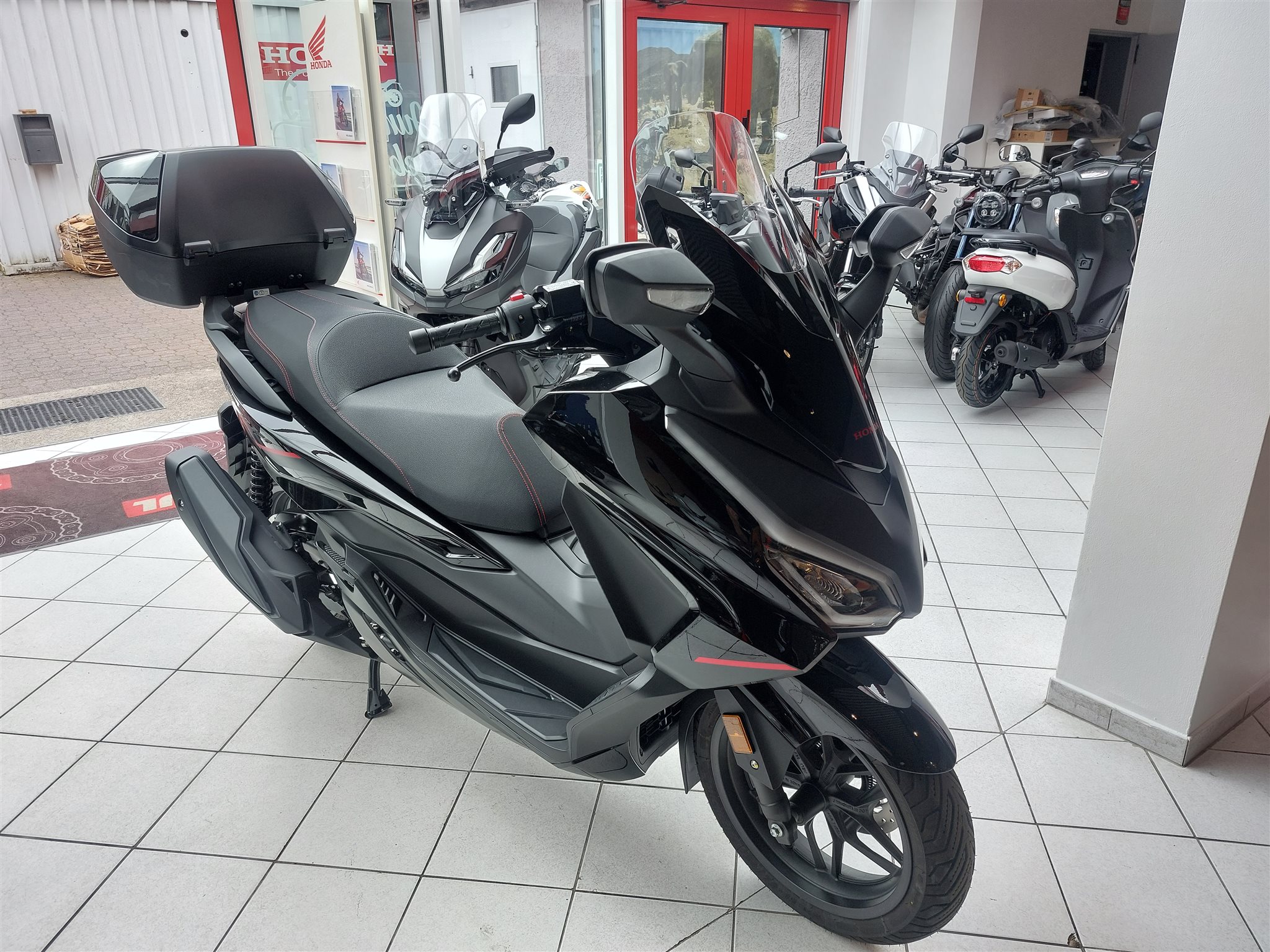 Honda Foirza 350 Special Edition, Neutfahrzeug, Modell 2026, schwarz, Keyless Go, elektrisch verstellbare Windschutzscheibe, Helmfach, 45 Liter Topcase mit Smart Key Funktion und Rückenpolster (abnehmbar), Voll LED Beleuchtung, Sitzbank mit roten Nähten abgenäht, Alueinsätze im Trittbrett, TFT Farbdisplay mit Konnektivität über Honda Road Sync App, CO2 Ausstoß 79 g/km, Abgasverhalten Euro 5+, Benzinverbrauch (Liter pro 100 km (Honda Messwerte gem. WMTC)) 3,4l /100km.